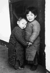 A child protects her brother from a stranger with a camera