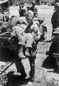 Corpsman carries wounded GI to medical station near Kwan-ni
