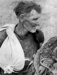 : old man looking at tobacco leaves while sac draped over his shoulders